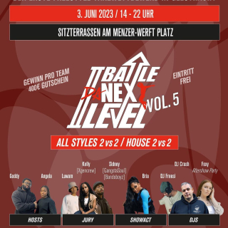 Am 3. Juni 2023 können Tänzer:innen Open-Air an der Elbe, bei den Sitzterrassen am Menzer-Werft-Platz, ihr Können unter Beweis stellen und in 2-er Teams in den Kategorien All Styles und House gegeneinander antanzen!