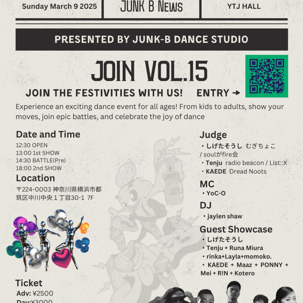 JOIN vol.15 3月9日(日) YTJホール(プレミア横浜7F) センター北駅前 12:30 OPEN 13:001st SHOW 14:30 BATTLE 15:30 Guest Showcase 18:00 2nd SHOW Guest Showcase ・しげたそうし ・Tenju +Runa Miura ・rinka+Layla+momoko. ・KAEDE+Maaz+PONNY+Mei+ R!N+Kotero JUDGE ・しげたそうし むぎちょこ/soulがfire会 ・Tenju radio beacon/List ::X ・KAEDE Dread Noots MC YoC-O JD jaylen shaw BATTLE U-15/Allages Prize Money U-15 ¥10.000 Allages ¥20.000 Entry ¥2500 ADV:¥2500 DAY:¥3000 未就学無料 #join #junkb #battle #freestylebattle @soushishigeta @tenju_gog @kkaedee327 @sho1_90.yoc_o @panda_sound_creative @ruffi_from_ydkr @kana0101funk @taisukethemantis @koji_sakino @erihapinear @1m2m2c4 @_yunq20_ @o.tomomiii @___layla.i @hanakinoshita_0 @hinako0816 @kazoo__domybest_house @maaz_1127 @yoko_921 @11_shunsuke_06