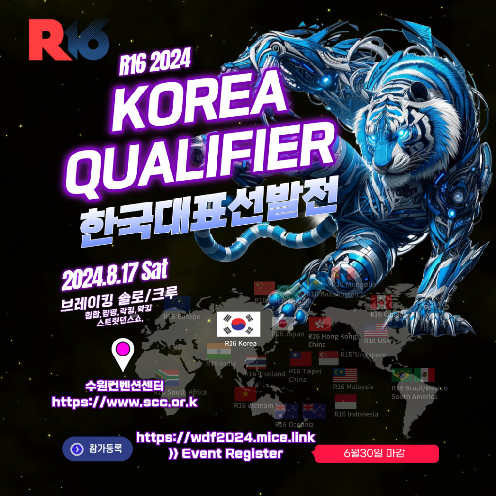 2024 R16 월드파이널은 2024년 8월 17~18일 수원컨벤션센터에서 개최됩니다.