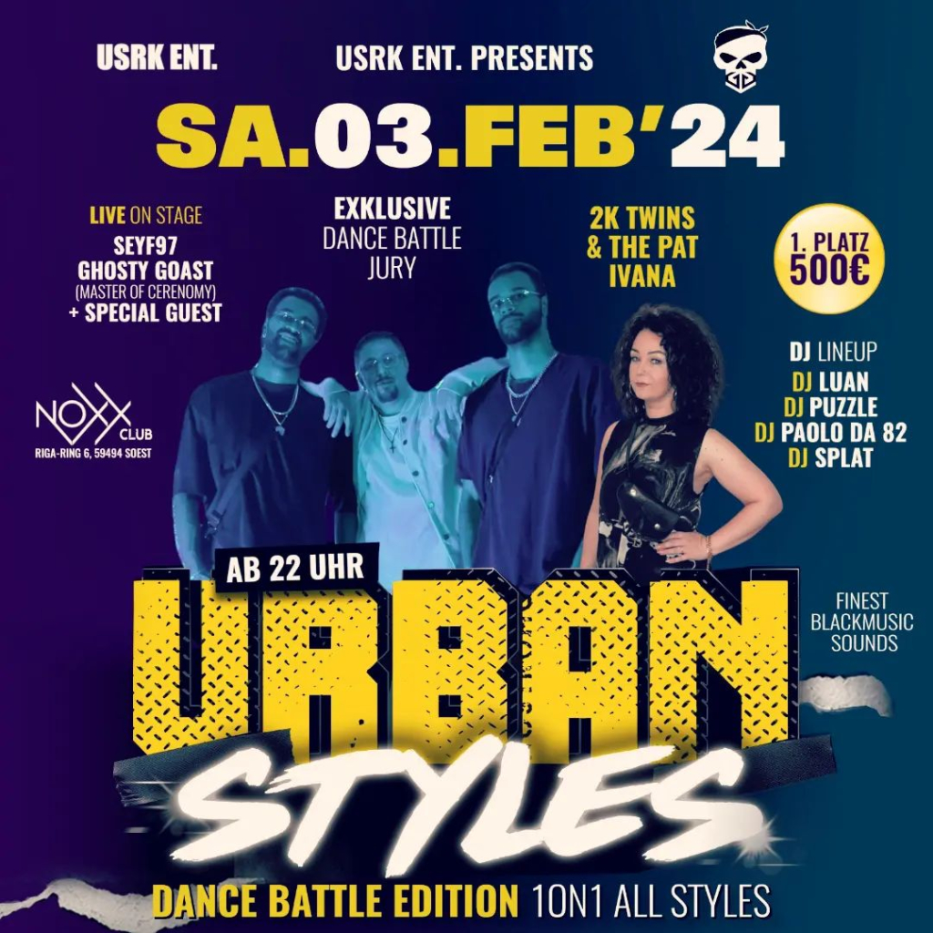 URBAN STYLES Dancebattle Edition 1 on 1 all styles💥 1 Platz 500€ 💥 Exklusiv Dancebattle Jury by 2K Twins @_kasan7_ @_kasham2_ , The Pat @patrick_thepat & Ivana @ivame2211 plus💿 Dj's @dj_luan_hoti @deejaypaoloda82 @dj__puzzle_officiall & Dj Splat 🎤 Live on stage @ghosty_goast & @seyf97official 📝 Anmeldung für das Battle an @ivame2211